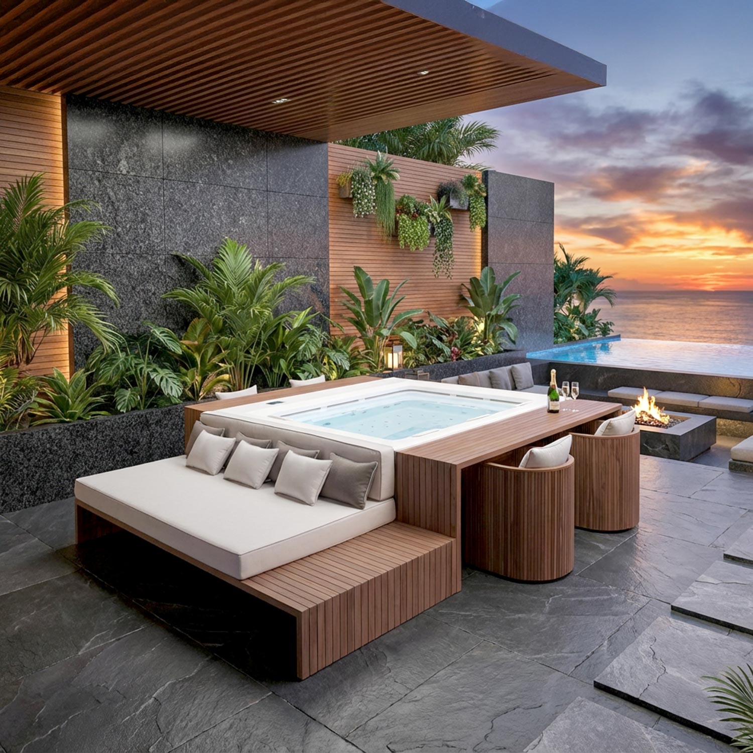 A beépített hangulatvilágítás LED-es hangulatvilágítás és a testreszabható oldalsó panelek biztosítják, hogy túlfolyós masszázsmedencéje könnyedén illeszkedjen bármilyen kültéri környezetbe.